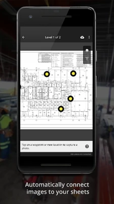 3. Tap the desired image location on the sheet and then tap the capture button to take a 360° image. Images are automatically timestamped and linked to the location on the floor plan. Repeat this process throughout your jobsite to capture the entire project then sync your project to your account.