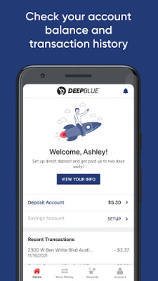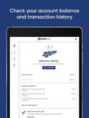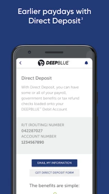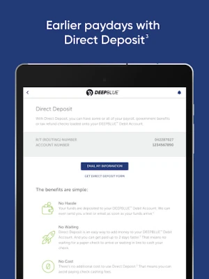 The DEEPBLUE™ Debit Account is a bank account that has the benefits you get from a bank with no credit check¹ or minimum balance requirements. Plus, you can get your tax refund faster² with Direct Deposit. Banking services provided by Republic Bank & Trust Company, Member FDIC.